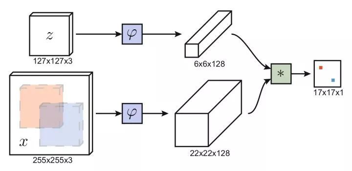 孿生網(wǎng)絡(luò) 類似于人臉驗證的思路,利用孿生網(wǎng)絡(luò),一支輸入第一幀包圍盒內(nèi)圖像,另一支輸入其他幀的候選圖像區(qū)域,輸出兩張圖的相似度。我們不需要遍歷其他幀的所有可能的候選區(qū)域,利用全卷積網(wǎng)絡(luò),我們只需要前饋整張圖像一次。通過互相關(guān)操作(卷積),得到二維的響應(yīng)圖,其中最大響應(yīng)位置確定了需要預(yù)測的包圍盒位置。基于孿生網(wǎng)絡(luò)的方法速度快,能處理任意大小的圖像。