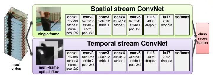 圖像+時序兩分支結(jié)構(gòu) 這類方法用兩個獨立的網(wǎng)絡(luò)分別捕獲視頻中的圖像信息和隨時間運動信息。其中,圖像信息從單幀靜止圖像中得到,是經(jīng)典的圖像分類問題。運動信息則通過光流(optical flow)得到,其捕獲了目標(biāo)在相鄰幀之間的運動情況。
