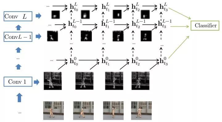 CNN+RNN捕獲遠(yuǎn)距離依賴 之前的方法只能捕獲幾幀圖像之間的依賴關(guān)系,這類方法旨在用CNN提取單幀圖像特征,之后用RNN捕獲幀之間的依賴。