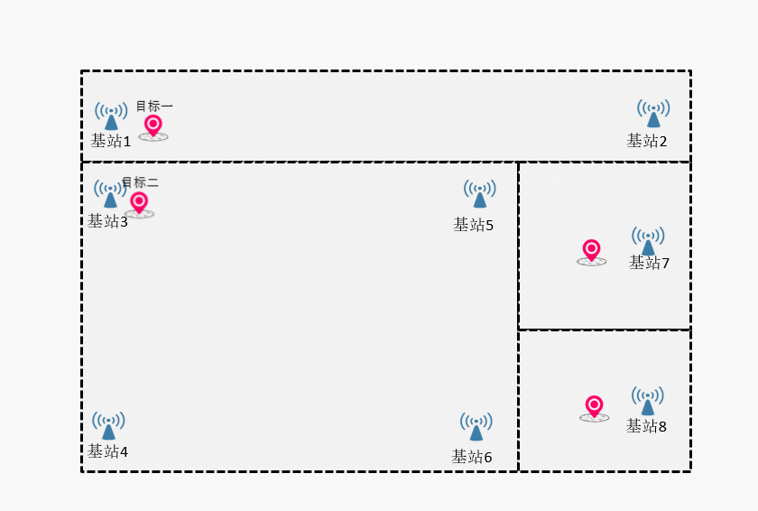 2:大區(qū)域通過基站3、4、5、6四個基站我們可以實(shí)現(xiàn)精確的2維定位;