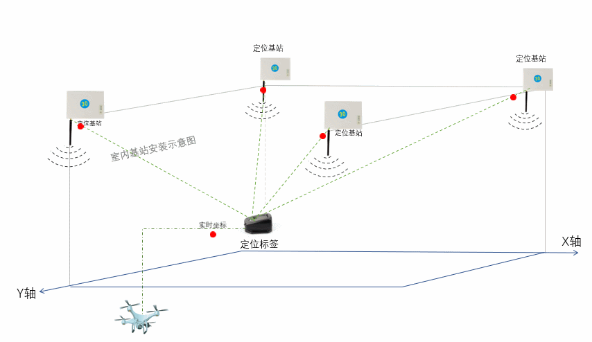 在需要定位的區(qū)域安裝一定數(shù)量的定位基站讓定位基站信號(hào)覆蓋需要定位的區(qū)域,無人機(jī)攜帶定位標(biāo)簽就可實(shí)現(xiàn)對(duì)目標(biāo)對(duì)象的分米級(jí)精確定位。