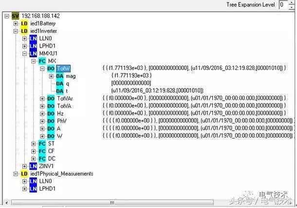 本文采用Omicron IEDScout測試服務(wù)端示例。配置測試軟件與服務(wù)端示例建立連接,測試軟件會讀取示例數(shù)據(jù)模型中各個變量的名稱和變量值,如圖3所示: