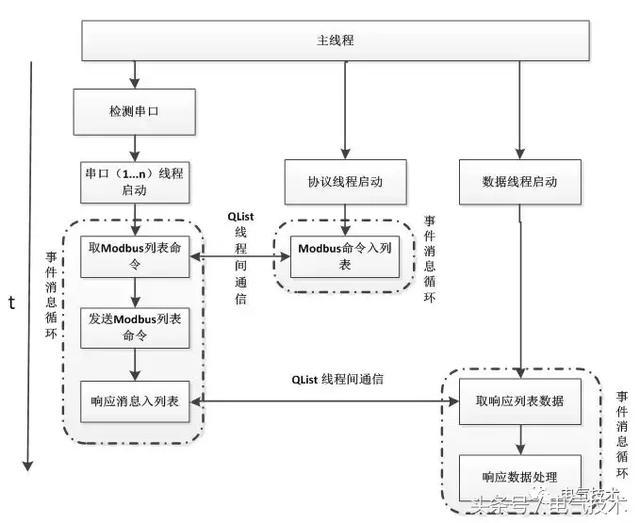 算法設(shè)計基于Qt應(yīng)用程序開發(fā)框架,功能實現(xiàn)采用QList列表類和QThread線程類。主程序讀取XML配置文件,根據(jù)所配置串口模式開啟串口通信線程,串口線程之間互不影響,支持不同modbus功能函數(shù)同時運(yùn)行,每個串口modbus數(shù)據(jù)采集命令發(fā)送和數(shù)據(jù)接收作為子線程并行運(yùn)行,系統(tǒng)資源耗費(fèi)更少,數(shù)據(jù)處理方式更高效;根據(jù)modbus數(shù)據(jù)啟動modbus數(shù)據(jù)解析線程,用QList作為線程間通信方法,方便數(shù)據(jù)擴(kuò)展,保證程序穩(wěn)定、高效運(yùn)行。算法設(shè)計如圖4所示。