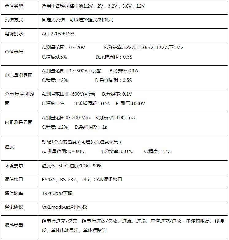 二、BCSU蓄電池組在線監(jiān)測系統(tǒng)技術(shù)參數(shù)