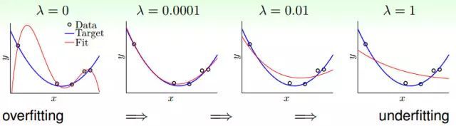 從上圖可以看出,當λ=0的時候就會發(fā)生過擬合的問題,當λ很小時(λ=0.0001),結果很接近理想的情況,如果λ很大(λ=1),會發(fā)生欠擬合的現象。所以加一點正則化(λ很小)就可以做到效果很好。