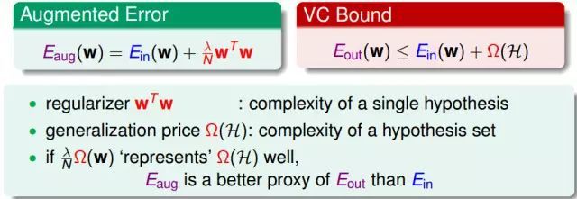 這兩個問題都好像是計算一個問題的復雜度,我們該怎么聯系著兩種復雜度的表示方式呢?其理解是,一個單獨的很復雜的多項式可以看做在一類很復雜的假設集合中,所以Eaug可以看做是Eout的一個代理人(proxy),這其實是我們運用一個比原來的Ein更好一點點代理人Eaug來貼近好的Eout。