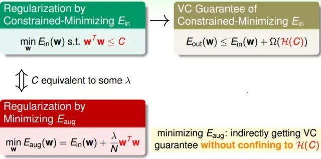 原始的問題對應的是VC的保證是Eout要比Ein加上復雜度的懲罰項(penalty of complexity)要小。而求解Eaug是間接地做到VC Bound,并沒有真正的限制在H(C)中。