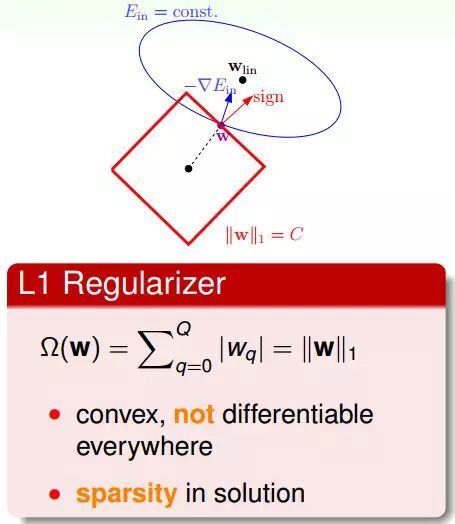 L1 Regularizer的最佳解常常出現在頂點上(頂點上的w只有很少的元素是非零的,所以也被稱為稀疏解sparse solution),這樣在計算過程中會比較快。