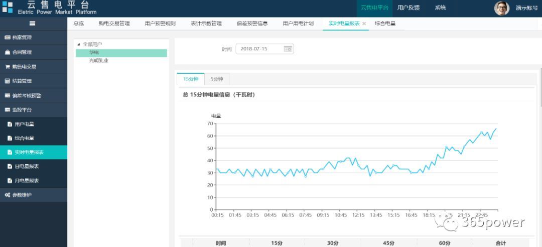 實(shí)時(shí)監(jiān)控用戶的用電情況,以報(bào)表曲線的形式直觀監(jiān)控用戶峰、平、谷的電量信息并為開展現(xiàn)貨市場(chǎng)提供了更精準(zhǔn)的數(shù)據(jù)依據(jù)。