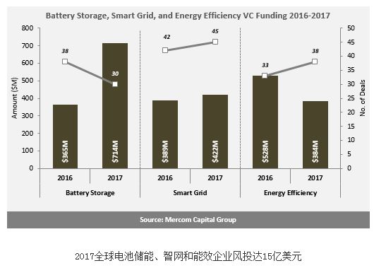 Mercom資本集團日前發(fā)布2017年智能電網、儲能和能效報告稱,2017年全球電池儲能、智網和能效企業(yè)風投資金累計達到15億美元,較之2016年的13