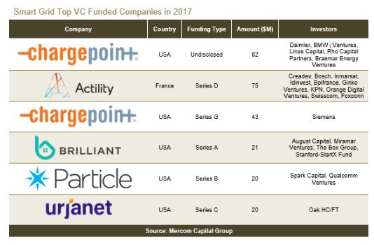2017年,智能電網領域獲得風投資金共計4.22億美元,涉及交易45個,去年為3.89億美元,涉及交易42個。