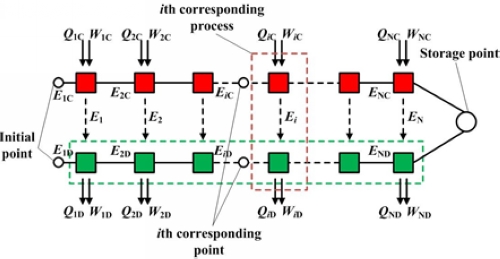 如圖1所示,壓縮空氣儲能系統(tǒng)流程存在對應性,將流程對稱的過程稱為對應過程,將流程上對稱的點稱為對應點,模型將儲能過程和釋能過程各分為N個過程,一一對應,從而形成N個對應過程(如圖中虛線框所示為第i個對應過程)和N+1個對應點。為了清晰表達系統(tǒng)中?轉(zhuǎn)換和傳遞特性,提出了熱-機械?(Eth-Emech圖)圖像?方法。相對于傳統(tǒng)的優(yōu)化分析方法,對應點分析優(yōu)化算法具有以下優(yōu)點:能夠清晰揭示儲能和釋能過程之間的能量傳遞機理;有利于探索不同熱力過程的耦合關(guān)系;有利于獲得系統(tǒng)性能改進和優(yōu)化的方向。