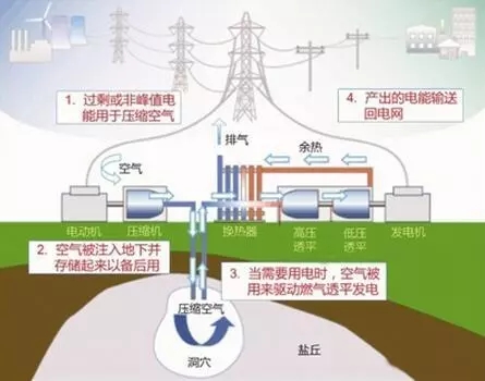 用電低谷時段,將空氣壓縮后儲存于鹽穴內(nèi),并將壓縮過程中產(chǎn)生的壓縮熱收集并存儲;用電高峰時段,壓縮空氣經(jīng)存儲的熱能加熱后進(jìn)入透平膨脹機做功發(fā)電。