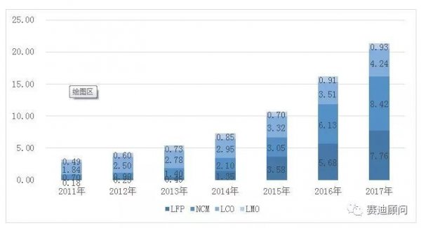 2011年—2017年全球不同類型鋰電池出貨量(GWh)