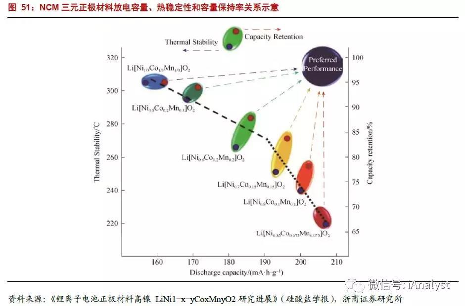 根據(jù)公開科技文獻(xiàn),三元材料具有和鈷酸鋰類似的α-NaFeO2型層狀巖鹽結(jié)構(gòu),適合鋰離子的嵌入與脫出,較橄欖石型的磷酸鐵鋰正極材料,在充放電倍率等性能上有更大優(yōu)勢,使得三元鋰電池較磷酸鐵鋰電池更具能量密度優(yōu)勢。圖50為三元正極材料制作過程及晶體結(jié)構(gòu)。鎳鈷錳酸鋰通過調(diào)配鈷、錳、鎳三種材料的比例,獲得不同的電極特性,如圖51所示。在可承受的熱穩(wěn)定性和容量保持度(capacity retention)范圍內(nèi),采用高鎳三元材料作為鋰離子電池正極材料,可以提高放電容量(discharge capacity),進(jìn)而提高電池能量密度。理論上講,應(yīng)用基于鎳酸鋰改性的高鎳三元正極材料,有望助力電池能量密度達(dá)到300Wh/kg。