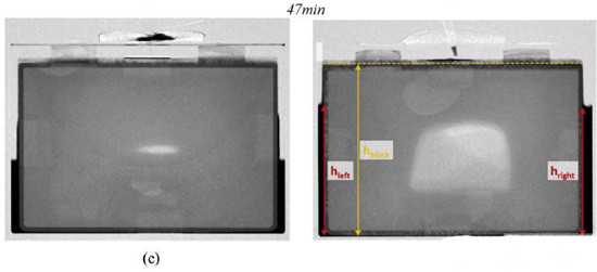 如何保證電解液在鋰電池電芯內(nèi)充分、均勻浸潤是一個困擾鋰電生產(chǎn)多年的難題,無數(shù)的鋰電工程師為之付出了大量的心血,德國博世公司的工程師W.J. Weydanz等人【1】利用中子衍射技術(shù)成功的觀測到了電解液在軟包鋰離子電池內(nèi)部的浸潤過程(如下圖所示,a,b,c真空注液,d、e、f常壓注液),可以看到注液2min后大部分電解液還停留在電芯的外部,在47min后真空注液的電池基本上完成了浸潤,但是常壓注液的鋰離子電池仍然有相當(dāng)部分的中間位置電芯沒有浸潤,電芯外部殘留了大量的電解液。W.J. Weydanz的研究表明真空注液能夠?qū)囯x子電池的注液時間縮短50%,并提高10%的注液量,這對于提高注液質(zhì)量和效率具有重要的意義。