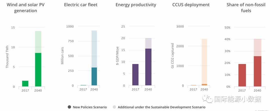 2017年全球非化石能源比例為19.2%;在新政策情景下,2040年全球非化石能源比例將達25.8%;而可持續(xù)發(fā)展情景所需要的非化石能源比例應為40%。