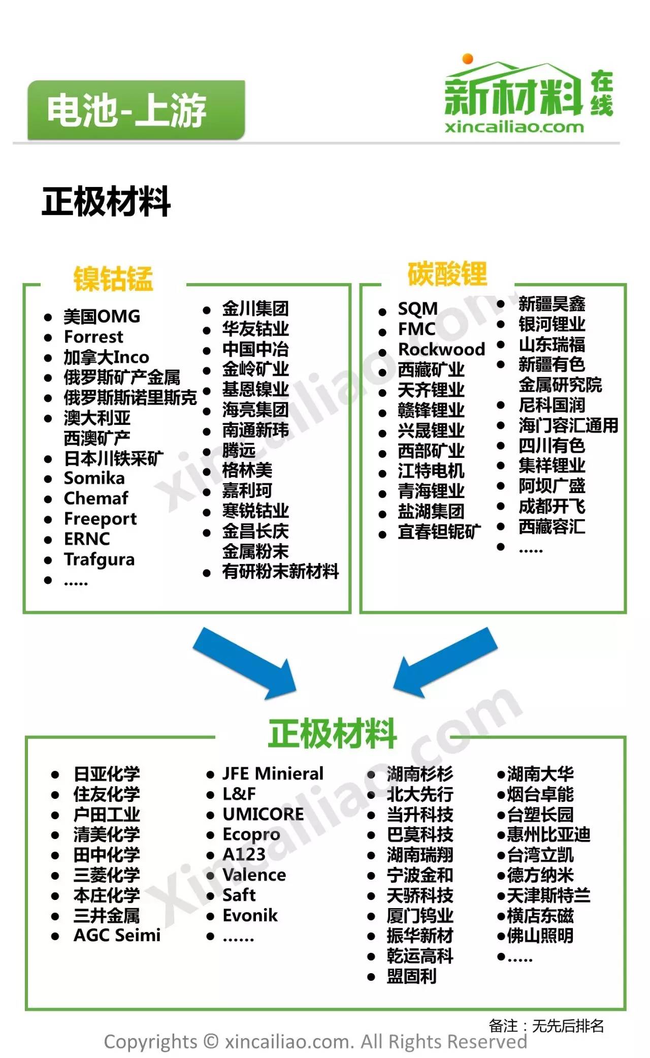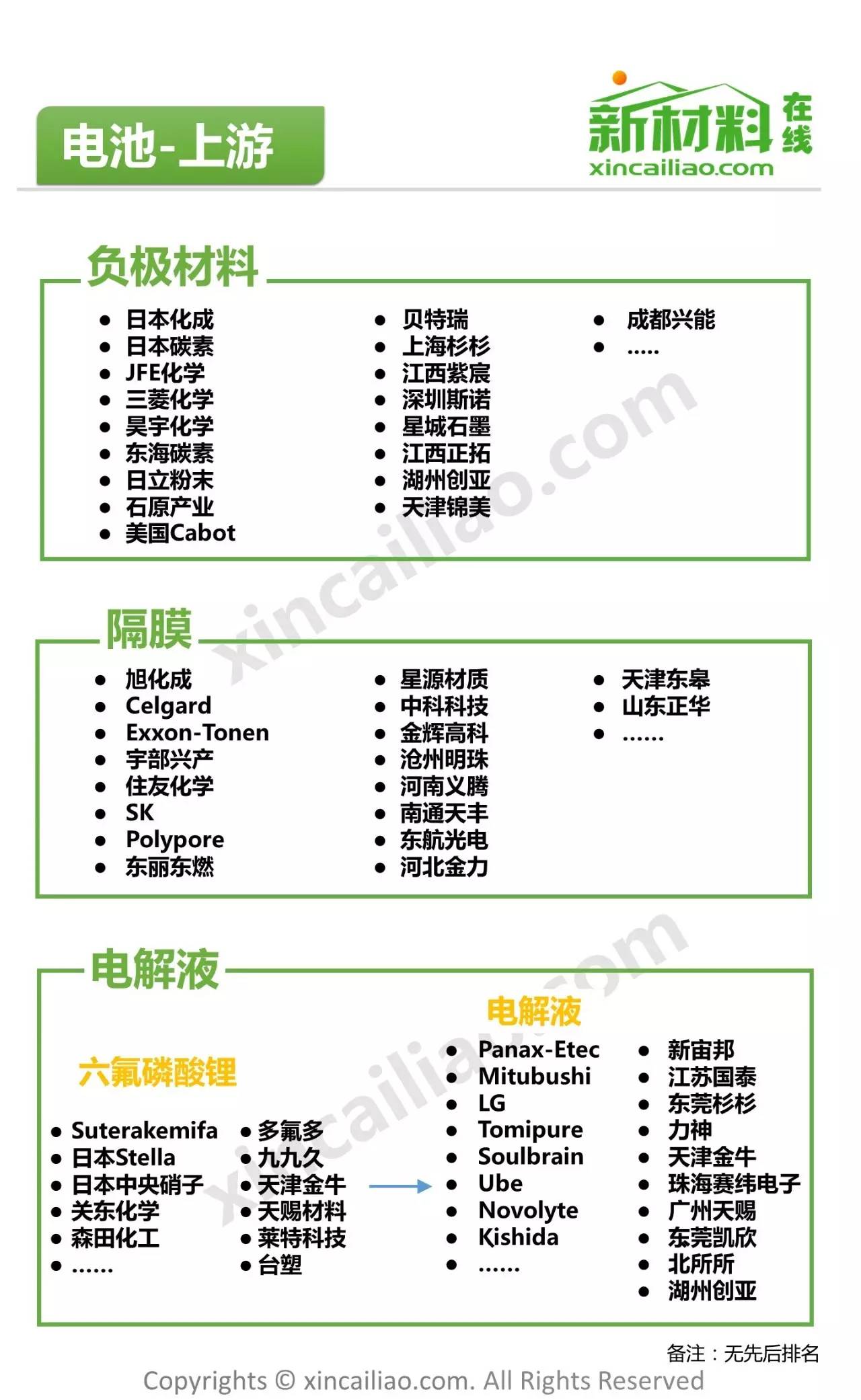一圖說(shuō)的形式展現(xiàn)了新能源汽車產(chǎn)業(yè)鏈的全景圖,主要包括動(dòng)力電池正極材料、負(fù)極材料以及電芯與pack廠商等。