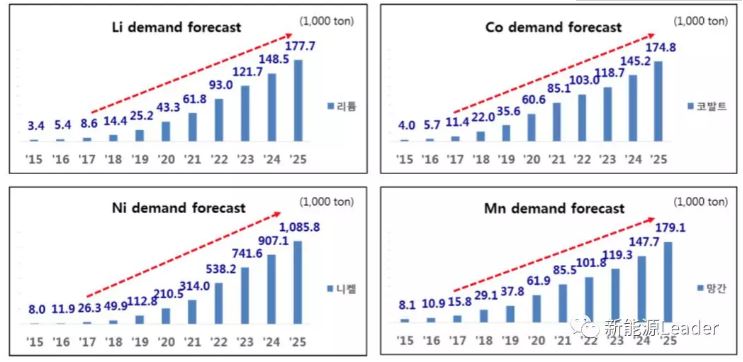 新能源汽車完整的產(chǎn)業(yè)鏈的最上游可以追溯到采礦業(yè),采礦業(yè)作為最為古老的產(chǎn)業(yè),其歷史可以追溯到距今一萬年五千年之前的舊石器時代,那時的人們采集石塊作為工具和武器,距今七千年之前的新石器時代的仰韶、馬家窯、大汶口文化人們已經(jīng)開始大規(guī)模的采用粘土燒制彩陶。這樣一個古老的行業(yè),至今仍然煥發(fā)著蓬勃的生機,2017年在動力電池需求的快速增長的刺激下,動力電池相關(guān)的金屬礦產(chǎn)需求快速攀升,電池級碳酸鋰更是出現(xiàn)了一鋰難求的局面。根據(jù)韓國SNE的預測,從現(xiàn)在到2025年動力電池行業(yè)Li資源的需求量年復合增長率將達到46%,鈷將達到41%,Ni將達到59%,Mn將達到36%。