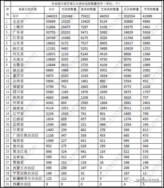 公共充電基礎設施數(shù)據(jù)省、區(qū)、市情況(不含港、澳、臺),省級行政區(qū)域內(nèi)所擁有的公共類充電樁數(shù)量前十的分別為:北京35869個、上海31866個、廣東30755個、江蘇24769個、山東19602個、浙江12181個、河北10872個、天津10660個、安徽10644個、湖北6880個。