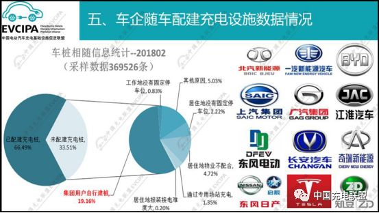 私人類充電基礎設施數(shù)據(jù)情況,截至2018年1月,通過聯(lián)盟內(nèi)成員整車企業(yè)采樣車樁相隨信息數(shù)據(jù)369526條,其中建設安裝私人類充電樁245683個,整體未配建率約33.5%,其中約19.1%是由于集團用戶采購純電動轎車作為出租車、分時租賃用車等運營專用車輛而不需要車企隨車配建充電設施所致。另一方面,因私購車的充電樁配建約為83.6%。