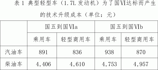 通過(guò)調(diào)研國(guó)際和國(guó)內(nèi)的相關(guān)技術(shù)文獻(xiàn),利用ICCT車輛成本模型,結(jié)合了內(nèi)部專家的技術(shù)判斷,分別對(duì)輕型汽油車和輕型柴油車進(jìn)行了技術(shù)升級(jí)帶來(lái)的成本評(píng)估。就汽油車而言,主要是評(píng)估三元催化器成本、汽油車顆粒物捕集器成本以及蒸發(fā)排放控制技術(shù)成本。至于柴油車,則主要是評(píng)估SCR系統(tǒng)成本,SCR系統(tǒng)將用于滿足國(guó)6a和6b的NOX、PM控制要求及OBD要求。表1是假設(shè)車輛平均裝載1.7升發(fā)動(dòng)機(jī)時(shí),為滿足國(guó)Ⅵ排放標(biāo)準(zhǔn)產(chǎn)生的技術(shù)升級(jí)費(fèi)用評(píng)估。