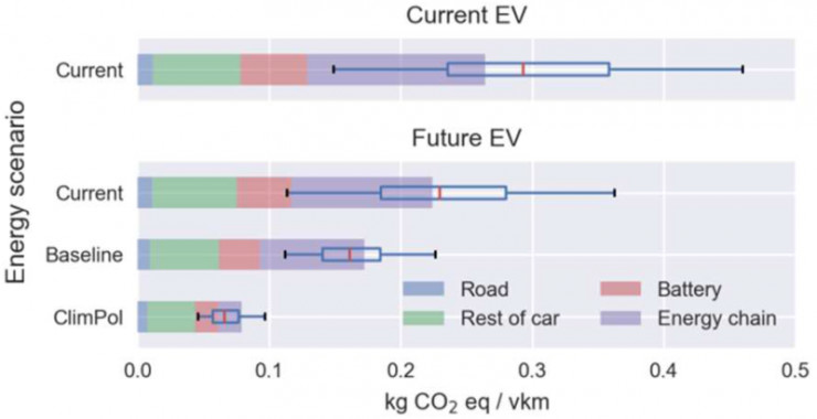 對(duì)電動(dòng)汽車等未來(lái)技術(shù)進(jìn)行生命周期評(píng)估(LCA)時(shí),通常假設(shè)用于基礎(chǔ)設(shè)施生產(chǎn)的背景數(shù)據(jù)庫(kù)是恒定的,并且未來(lái)的電力組合只需要考慮直接消費(fèi)。我們發(fā)現(xiàn),在計(jì)算電動(dòng)汽車生產(chǎn)的上游影響時(shí),若忽略未來(lái)電力系統(tǒng)的改善,會(huì)使結(jié)果的二氧化碳當(dāng)量改變23-52克每公里,這種錯(cuò)誤明顯超過(guò)ClimPol(德國(guó)IASS研究所的氣候變化和空氣污染項(xiàng)目)場(chǎng)景規(guī)定的兩個(gè)標(biāo)準(zhǔn)差。因此,尤其將來(lái)使用可再生電力為電動(dòng)汽車充電的情況下,考慮電力行業(yè)的發(fā)展極為重要。