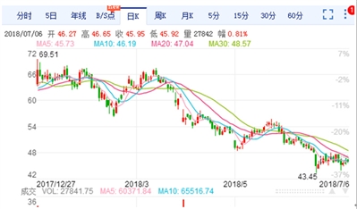 未來,隨著比亞迪拆分其鋰電池業(yè)務(wù),并讓其獨(dú)立上市后,其電池業(yè)務(wù)將獲得更大的發(fā)展空間,再加上其蒸蒸日上的新能源汽車業(yè)務(wù),比亞迪的盈利也將恢復(fù)。雖然其目前股價走上不甚理想(見圖四),但前景可期。截至7月6日收盤,其股價為46.03元,市盈率為35.24,市凈率為2.46,具備較好的投資價值。