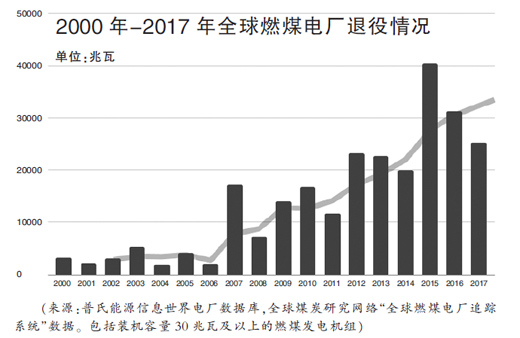 與此同時,過去20年間,全球燃煤機組的退役量出現(xiàn)了大幅的上升。2015年至2017年的三年期間尤為明顯,全球共有約97吉瓦的燃煤機組退役,數(shù)量創(chuàng)歷史新高。其中,美國以45吉瓦、中國以16吉瓦、英國以8吉瓦位居前列。