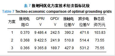 與方案1相比,方案2接地電阻和GPR水平偏低0.7%,GPD水平相差不多,接觸電位差和跨步電位差均在安全限值內(nèi),但靜態(tài)投資相差30.28萬元,方案2的靜態(tài)投資比方案1低29%。