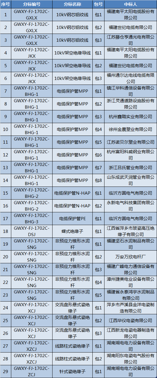 國(guó)網(wǎng)福建省電力有限公司2017年第二次配網(wǎng)線路材料協(xié)議庫存招標(biāo)采購項(xiàng)目中標(biāo)結(jié)果公告