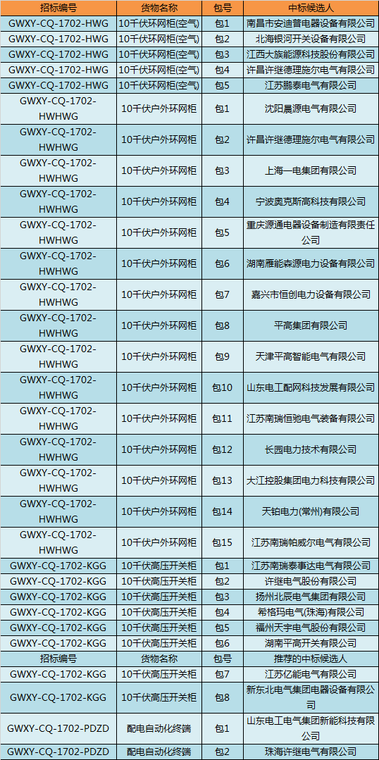國網(wǎng)(重慶)2017年第二次配網(wǎng)設(shè)備/線材協(xié)議庫存中標(biāo)結(jié)果