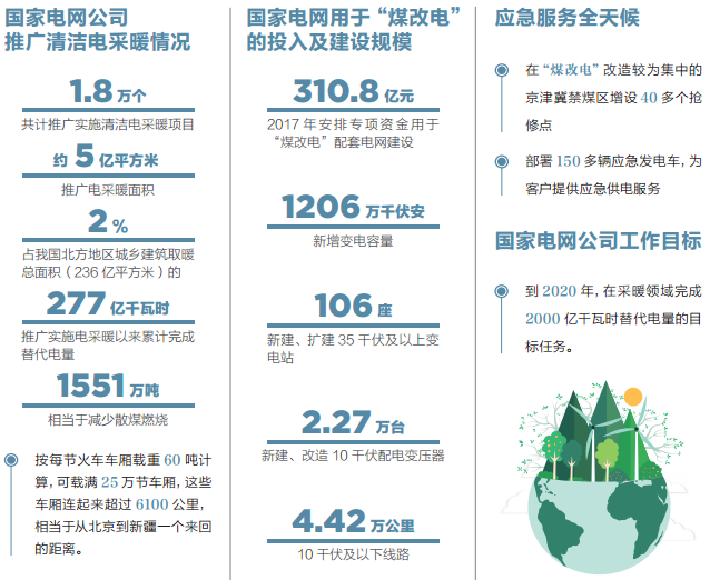 為此,國家電網公司成立了各級專項工作組,具體組織實施“煤改電”工作。為了保障“煤改電”負荷用電要求,各級供電企根據地方政府確定的改造范圍和規(guī)模,評估電網供電能力,調整電網建設年度計劃。2017 年,國家電網公司安排 310.8 億元專項資金,用于“煤改電”配套電網建設,新建、擴建 106 座 35 千伏及以上變電站,新增變電容量 1206 萬千伏安;新建、改造 10 千伏配電變壓器 2.27 萬臺,10 千伏及以下線路 4.42 萬公里。為確保配套電網建設進度與政府“煤改電”工作有效銜接,保障按時供電,國家電網公司強化內部協(xié)同,建立“日管控、周調度、關鍵節(jié)點重點督導”等工作制度,以村為單位細化工程施工計劃,落實工作責任。截至 9月底,累計完成京津冀及周邊地區(qū)居民“煤改電”用戶 175 萬戶、5763 個村的改造任務,供暖面積超過 1 億平方米。