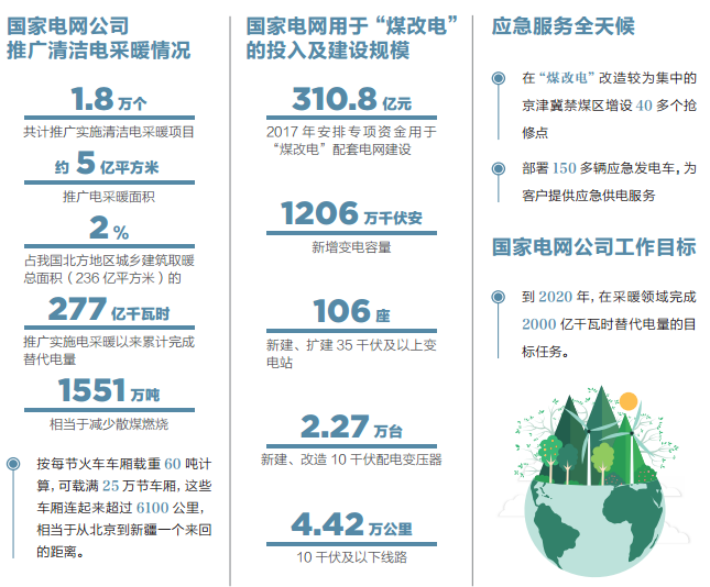 為此,國家電網(wǎng)公司成立了各級專項工作組,具體組織實施“煤改電”工作。為了保障“煤改電”負荷用電要求,各級供電企根據(jù)地方政府確定的改造范圍和規(guī)模,評估電網(wǎng)供電能力,調整電網(wǎng)建設年度計劃。2017 年,國家電網(wǎng)公司安排 310.8 億元專項資金,用于“煤改電”配套電網(wǎng)建設,新建、擴建 106 座 35 千伏及以上變電站,新增變電容量 1206 萬千伏安;新建、改造 10 千伏配電變壓器 2.27 萬臺,10 千伏及以下線路 4.42 萬公里。為確保配套電網(wǎng)建設進度與政府“煤改電”工作有效銜接,保障按時供電,國家電網(wǎng)公司強化內部協(xié)同,建立“日管控、周調度、關鍵節(jié)點重點督導”等工作制度,以村為單位細化工程施工計劃,落實工作責任。截至 9月底,累計完成京津冀及周邊地區(qū)居民“煤改電”用戶 175 萬戶、5763 個村的改造任務,供暖面積超過 1 億平方米。