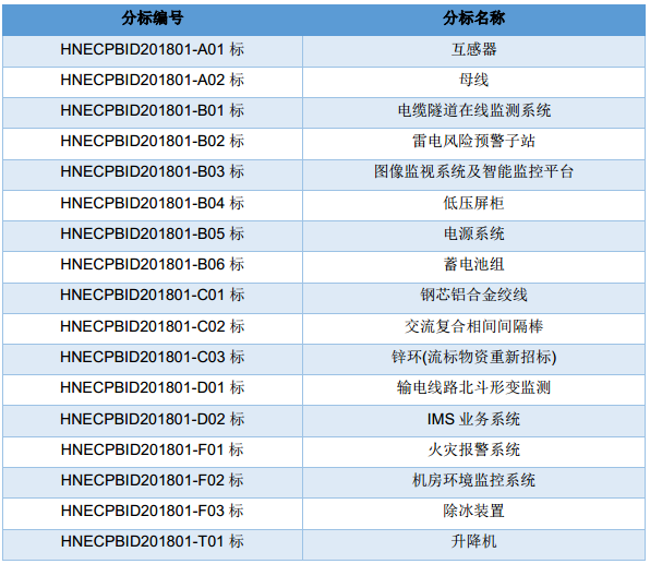 招標(biāo)編號(hào)為:HNECPBID201801,分標(biāo)編號(hào)及分標(biāo)名稱見下表,貨物清單單獨(dú)成冊。
