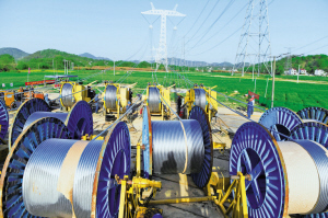 4月8日,在安徽省繁昌縣境內,安徽送變電工程有限公司施工人員進行準東至皖南±1100千伏特高壓輸電工程放線施工。